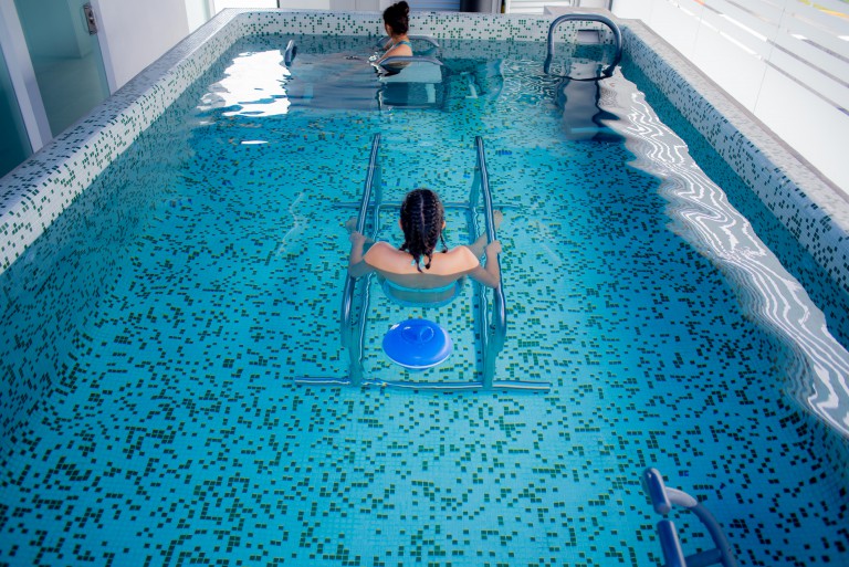 Piscina con temperatura de 37ºC donde se realiza ejercicio terapéutico para mejorar la movilidad y fortalecer segmentos corporales de acuerdo a la indicación del médico.